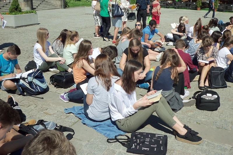Młodzież zastygła podczas cichego czytania, by później utworzyć łańcuch czytelniczy wokół pomnika Kazimierza Wielkiego i zbudować żywy obraz książki. Towarzyszyły temu głośno czytane sentencje związane z książką.