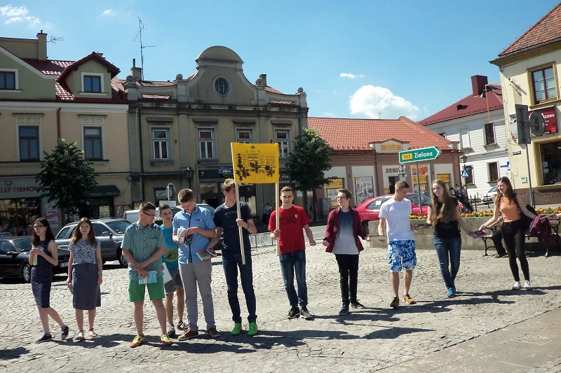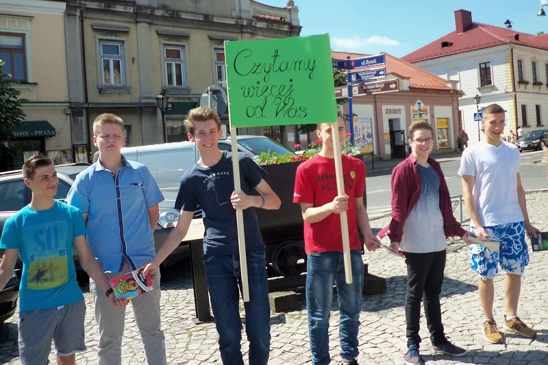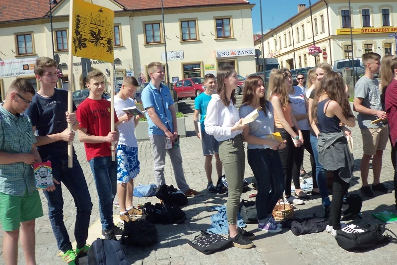 On June 1st our students took part in a flash mob which was held at the market square in Bochnia. About 200 people, mostly high school students, decided to join the event started by the „Libraries in School”. The participants stood still reading quietly, than they surrounded the Casimir the Great monument and then they created a live image of the book. In that way they promoted reading among the inhabitants of Bochnia.