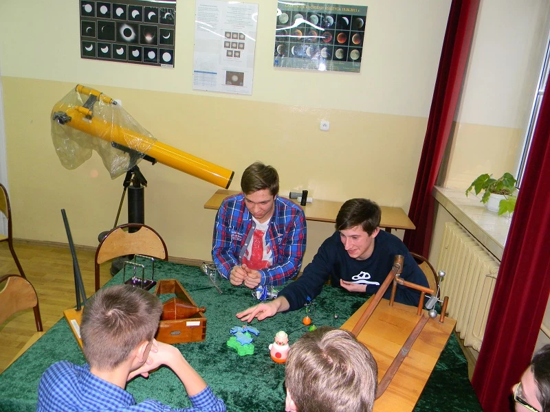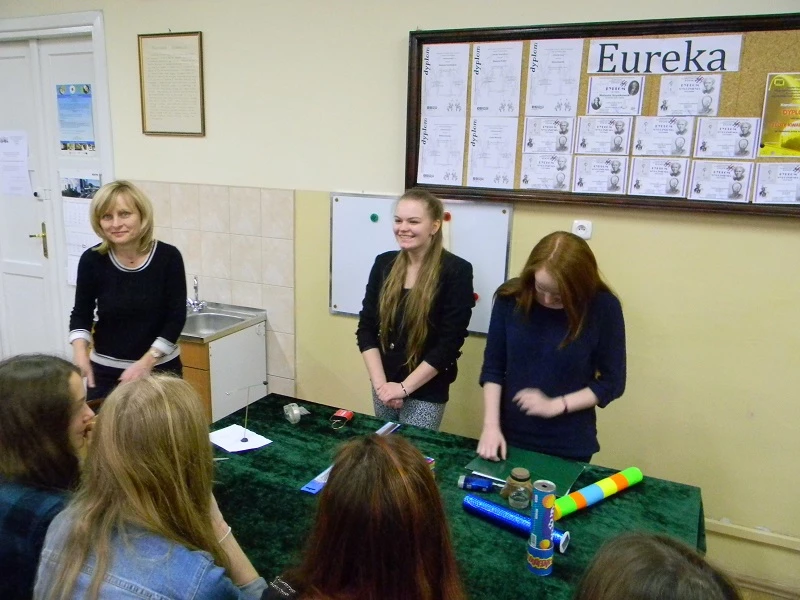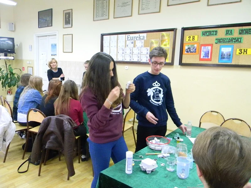 W ramach warsztatów, uczniowie każdej z grup mieli też okazję zobaczyć ponad 30 doświadczeń przeprowadzonych przez uczniów klas: 3h (Annę Chmielewską, Agnieszkę Pielę) oraz 2b (Gabrielę Wolak, Natalię Nowosińską, Magdę Banach, Patrycję Szumańską, Mateusza Gicalę, Pawła Waśniowskiego i Sławka Gicalę), którzy cierpliwie prezentowali i wyjaśniali „ Jak i dlaczego się to dzieje? " oraz odpowiadali na liczne pytania gimnazjalistów.