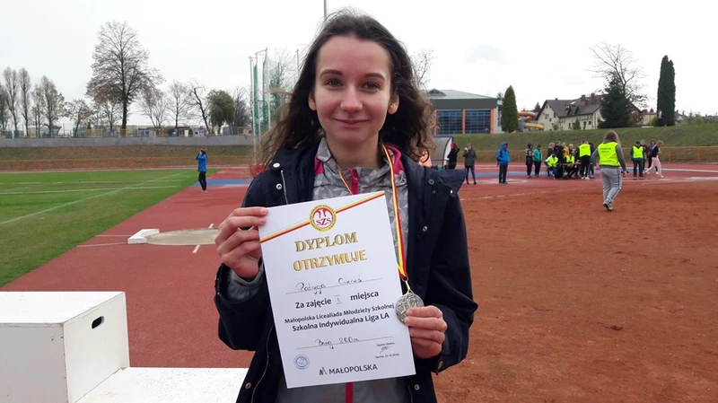 Patrycja Ciuruś z klasy 2j, która została wice mistrzynią Małopolski zajmując 2 miejsce w biegu na 800m,