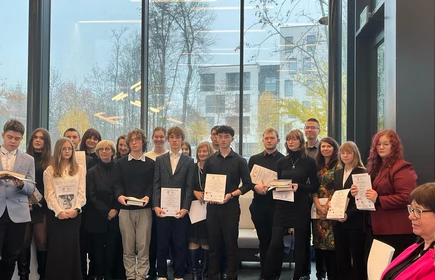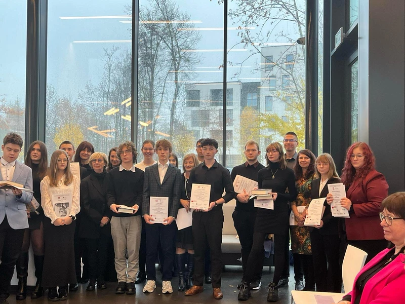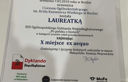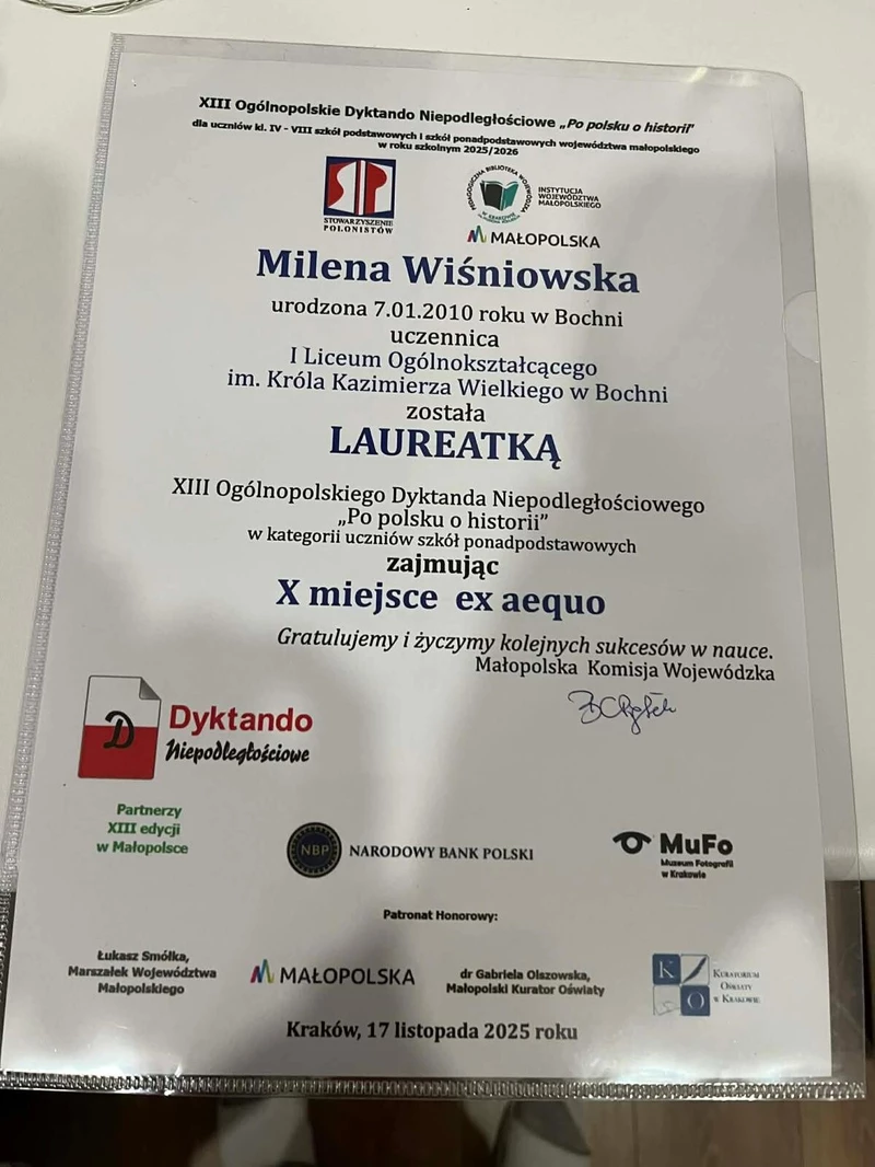 I semestr roku szkolnego 2025/2026 obfitował w wiele interesujących wydarzeń. Nasi uczniowie wzięli udział w XIII Ogólnopolskim Dyktandzie „Po polsku o historii”. Konkurs organizuje działające przy Uniwersytecie Jagiellońskim Stowarzyszenie Polonistów oraz fundacja „Zawsze warto”. Do etapu wojewódzkiego zakwalifikowały się dwie uczennice naszej szkoły: Milena Wiśniowska z klasy 1e oraz Anna Grześkiewicz z klasy 3c.