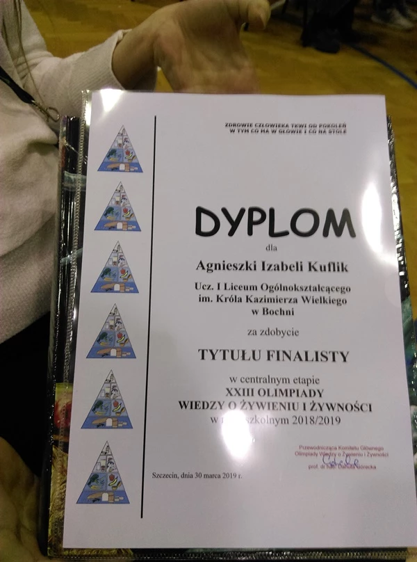 Po raz dwudziesty trzeci Komitet Główny Olimpiady zorganizował rywalizację uczniów ze szkół licealnych oraz technikum o profilu gastronomicznym i dietetycznym. Młodzież musiała wykazać się znajomością wiedzy w zakresie żywienia i żywności. Tematyką wiodąca tegorocznej edycji była technologia produktów mlecznych i ich rola w żywieniu człowieka. W piątek, 29 marca br. w Zespole Szkół Gastronomicznych nr 6 Szczecinie odbyły się wzmagania finałowe XXIII Olimpiady Wiedzy o Żywieniu i Żywności, Bochnię, a zarazem ILO reprezentowała Agnieszka Kuflik uczennica klasy III c o profilu biologiczno- chemicznym. Agnieszka uzyskała tytuł Finalistki Olimpiady. Bezcenną nagrodą dla uczennicy są doświadczenia „ olimpijczyka” i prawdziwa uczta intelektualna w której uczestniczyła. Czas spędzony w Szczecinie był również okazją do podziwiania talentów aktorskich i kulinarnych uczniów ZS nr 6 w Szczecinie. Nie zabrakło też atrakcji turystycznych podczas zwiedzania obiektów architektury miasta. Finał olimpiady- 30 marca – oficjalne wręczenie nagród i dyplomów uczestnikom olimpiady. W programie również uwzględnione były wykłady nauczycieli akademickich UP – prof. Gawęcki wygłosił wykład zatytułowany „Wiedza i para wiedza o zdrowym odżywianiu”, dr A. Drozd " Dlaczego warto czytać etykiety- czyli jak nie dać nabić się w butelkę przy sklepowej półce. Organizatorem XXIII Olimpiady, która z roku na rok cieszy się coraz większym zainteresowaniem był Uniwersytet Przyrodniczy w Poznaniu, a współorganizatorem olimpiady Zespół Szkół Nr 6 im. Mikołaja Reja w Szczecinie.