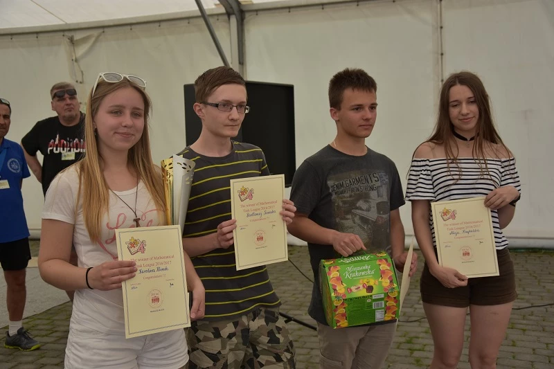 Finał konkursów odbył się 1 czerwca 2017 o godz. 9.15. Z matematyki uczniowie mieli do rozwiązania 10 zadań. Najlepiej z zadaniami poradziła sobie grupa H z klasy 1b z naszej szkoły uzyskując 29p(36p). W zwycięskiej drużynie byli: Alicja Krzykalska, Karolina Klimek, Piotr Makarewicz, Paweł Nowak, Bartłomiej Sosenka oraz Piotr Kica. Grupa ta równocześnie wygrała cały matematyczny konkurs uzyskując 95 punktów na 106 punktów możliwych do zdobycia. Drugie miejsce zdobyła grupa F z Novego Mesta na Morawach uzyskując 70 punktów a trzecie miejsce grupa J z naszej szkoły z wynikiem 62 punkty. Sukces uczniów klasy 1b jest tym większy ,bo przechodni puchar jeszcze nigdy nie opuścił naszej szkoły.