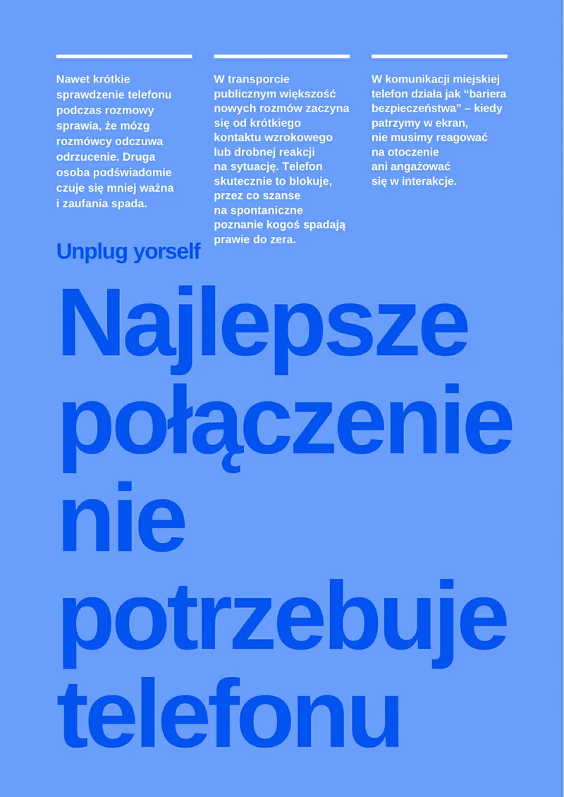 W komunikacji miejskiej telefon może działać jak bariera – gdy pasażer skupia się na ekranie, rzadziej reaguje na otoczenie i rzadziej angażuje się w interakcje społeczne. Celem projektu jest zwrócenie uwagi na ten problem oraz zachęcenie młodych ludzi do bardziej świadomego korzystania z technologii, a także do budowania relacji w świecie rzeczywistym.