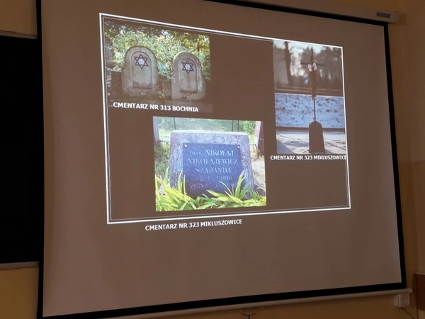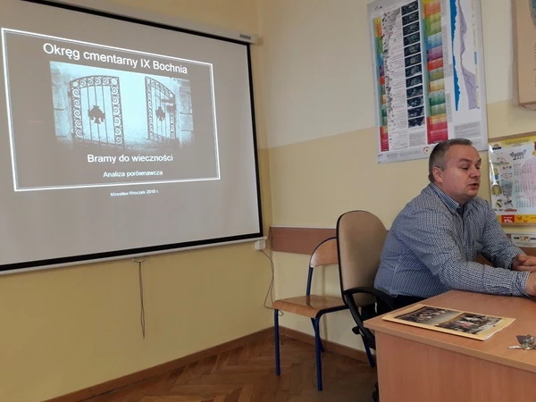 Pan Mirosław Mroczek- historyk, kolekcjoner i fotograf opowiedział o przebiegu działań wojennych w naszym powiecie w latach 1914-1915 oraz przedstawił prezentację o cmentarzach pierwszowojennych w naszej okolicy, mówiąc o ich powstaniu, założeniach i architekturze.