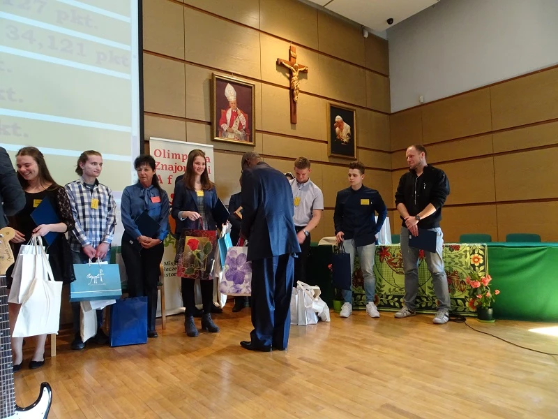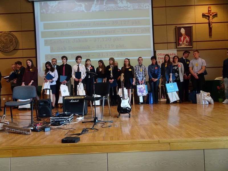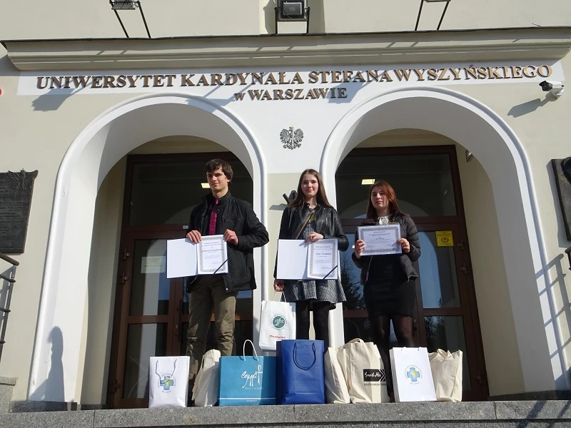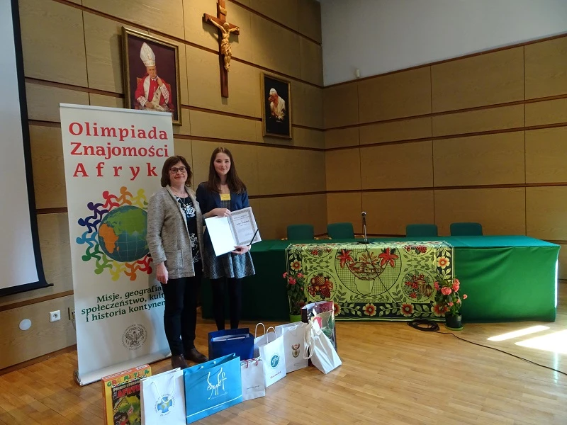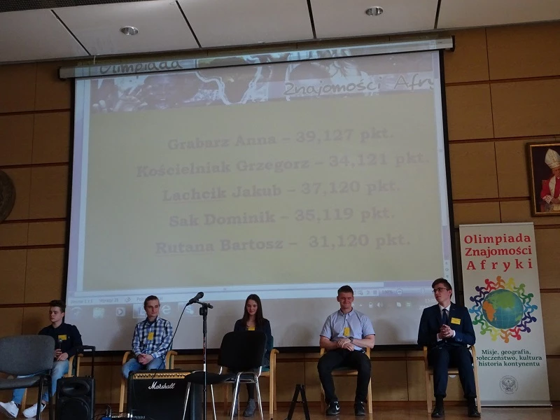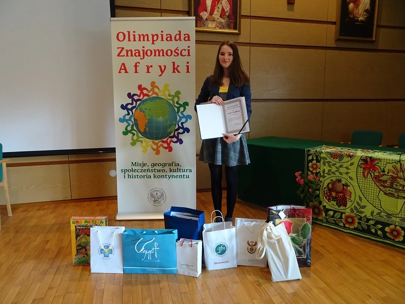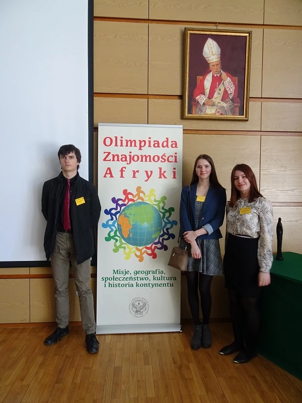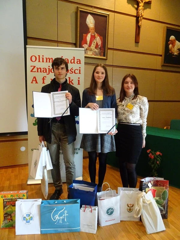 zorganizowana przez Uniwersytet Kardynała Stefana Wyszyńskiego. W zawodach na szczeblu centralnym, wśród 55 uczestników było trzech reprezentantów naszej szkoły. Pierwsze miejsce i tytuł Laureata zdobyła uczennica klasy 2g – Anna Grabarz, która uzyskała najwyższy wynik podczas części pisemnej i utrzymała prowadzenie w czasie części ustnej, podczas której udzielała odpowiedzi w auli przy wszystkich uczestnikach. Dominik Zwierniak z klasy 2e uzyskał tytuł Laureata, zajmując dziewiąte miejsce, a Joanna Mazurek z klasy 2g uzyskała tytuł Finalisty (Joannie zabrakło tylko jednego punktu do tytułu Laureata). Należy docenić osiągnięcia naszych uczniów, gdyż olimpiada ta jest interdyscyplinarna i obejmuje wiedzę dotyczącą Afryki z pogranicza różnych przedmiotów: geografii, historii, wiedzy o społeczeństwie i religii. Finał zawodów centralnych uświetnili swoją obecnością przedstawiciele ambasad niektórych państw afrykańskich. Uczestnicy obejrzeli także występ afrykańskiego muzyka Ricky`ego Liona.