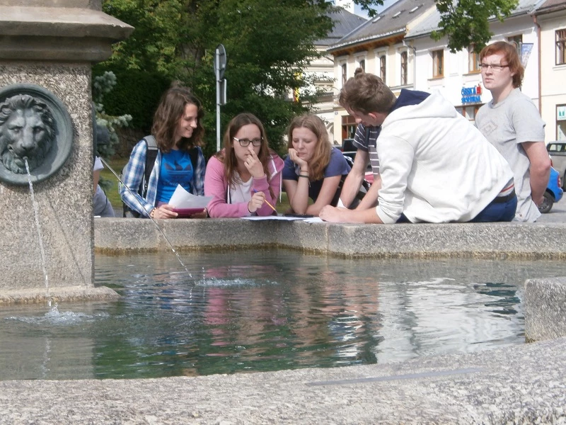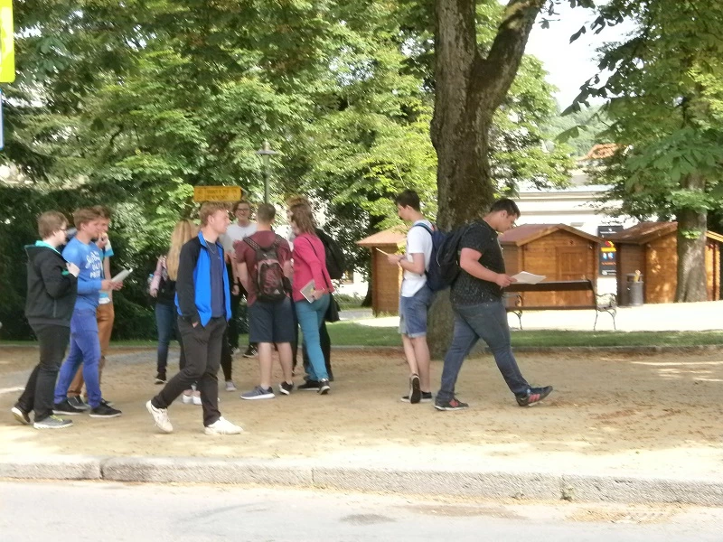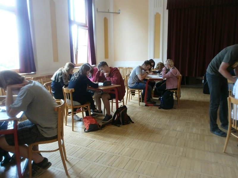 Wizytę w Nowym Mieście rozpoczęliśmy od wspólnego posiłku, by wkrótce potem w pełni sił przystąpić do finałowej rundy Ligi. Najpierw przez półtorej godziny rozwiązywaliśmy 10 zadań o różnym stopniu trudności. Dodatkowym utrudnieniem było to, że treści zadań napisane zostały w języku angielskim, więc słowniki okazały się niezbędne. Następnie rozpoczęła się nieco ciekawsza część finału. Po połączeniu w drużyny polsko-czeskie przystąpiliśmy do rundy „w terenie”. Naszym zadaniem było przykładowo policzenie schodów w szkole, kasztanowców w parku lub wysokości wieży kościelnej. Wszyscy z ogromnym entuzjazmem podeszliśmy do rozwiązywania zadań. Dzień matematycznych zmagań zakończyliśmy wieczorkiem integracyjnym, podczas którego mogliśmy zajadać się pysznymi potrawami z grilla, a także zagrać w kręgle.