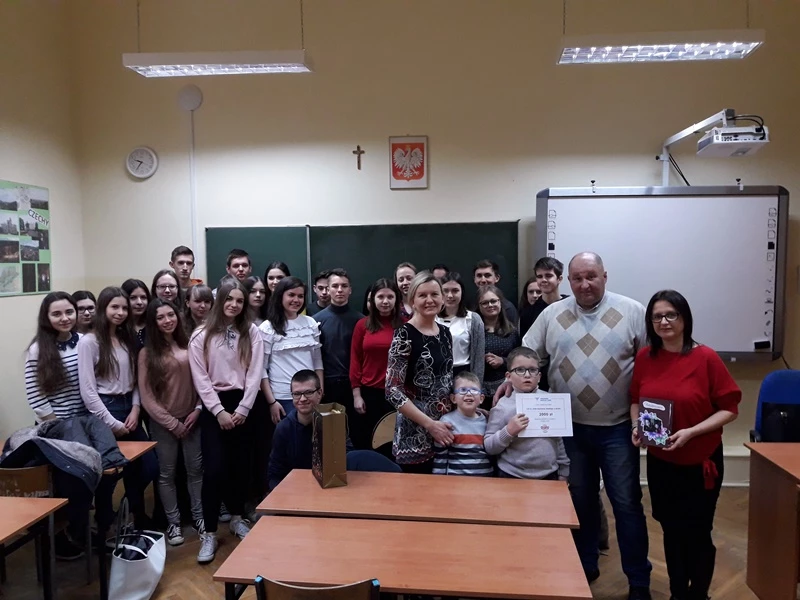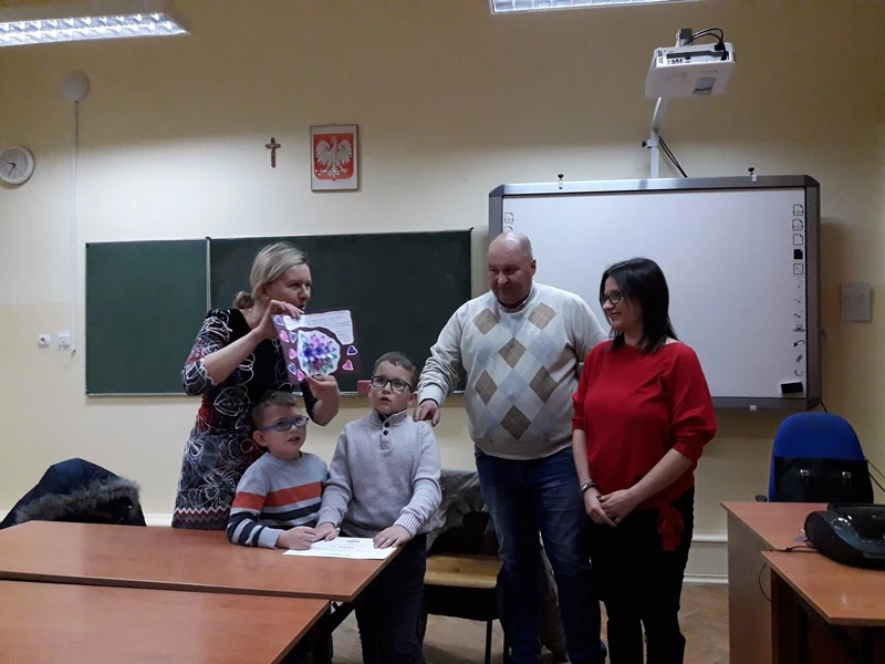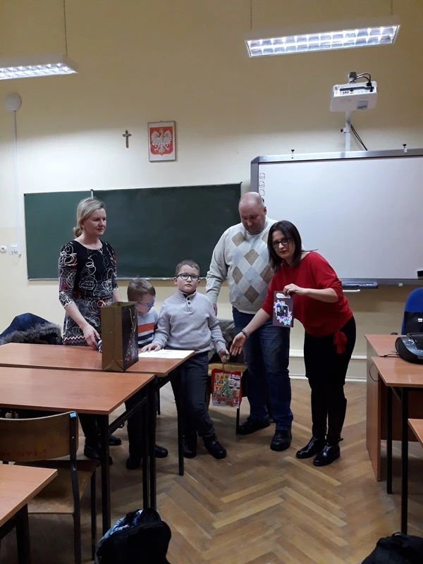 In the last school year, students of class 1c (now 2c) together with the teacher Anna Marciszewska-Jaszczyńska participated in the social campaign "Second Life. Transplantation - you have the gift of healing. " The activities that they undertook in the school and the local environment have been recognized by Polish Association of Dialyzed People, the organizer of the campaign. The students won the main prize in the Małopolska edition of the campaign. The prize was a check worth PLN 2,000, which was given to two brothers: 8-year-old Kacper and 7-year-old Kamil, the children of the foundation "Help on Time". The boys are severely ill. Before the winter holidays, Kacper, Kamil and their parents visited our school. Despite their serious diseases and many adversities, the boys are very cheerful and friendly.They immediately took to their older friends who offered help to them. Kacper, Kamil and their parents thanked the students with beautiful cards that the boys had made themselves.