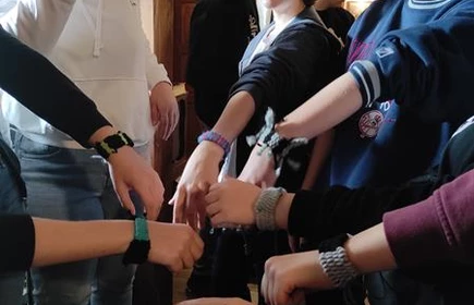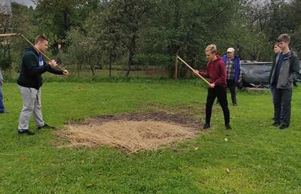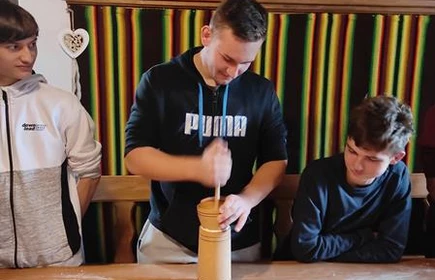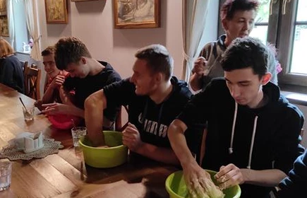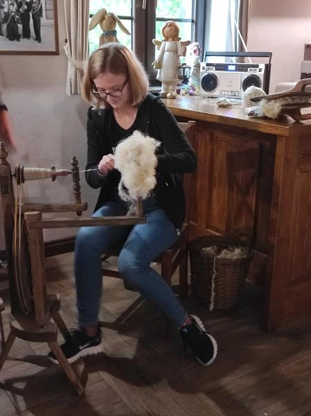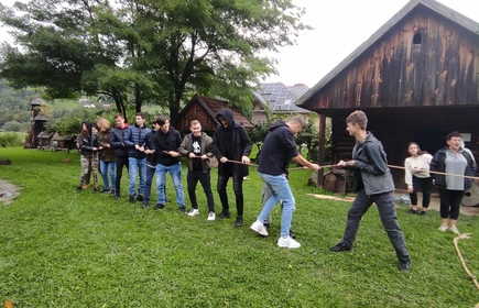 Były to ciekawe doświadczenia pokazujące, jak ciężkie było życie zanim pojawił się prąd czy maszyny. W Jędrzejkówce mogliśmy także zasmakować racuchów, własnoręcznie wyrabianych podpłomyków, pierogów oraz wędzonych śliwek. Ponadto niektórzy z nas postanowili samodzielnie wykonać bransoletki z kolorowych sznurków. Ciekawa okazała się też rywalizacja w przenoszeniu wody przy pomocy nosideł, przeciąganiu liny oraz innych konkurencjach. Miłośnicy zwierząt również byli zadowoleni ze spotkania z danielami, kozami, owcami oraz przyjaznym psem, który podążał ciągle za nami. Na pożegnanie gospodyni życzyła nam, abyśmy w życiu robili to, co kochamy oraz umieli wsłuchiwać się w swój wewnętrzny głos.