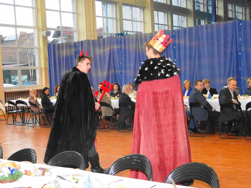Gwiazda, Anioł, Maryja, Herod, Diabeł, Żyd, Pasterze z Turoniem - tradycyjni ludowi kolędnicy przybyli we wtorek po południu na szkolną wigilię dla nauczycieli, emerytów i pracowników szkoły, żeby opowiedzieć (z przymrużeniem oka) i wyśpiewać historię Bożego Narodzenia. Przygrywały im połączone siły różnych kapel, orkiestr i zespołów. Były też życzenia od pani dyrektor Jolanty Kruk, Rady Rodziców oraz Samorządu szkolnego. I w ten sposób rozpoczęliśmy świętowanie.