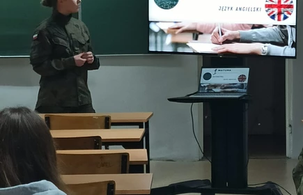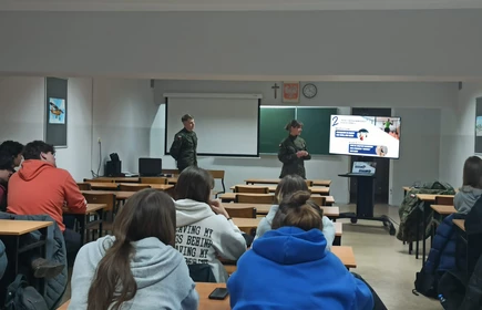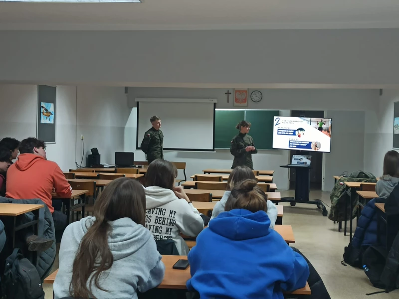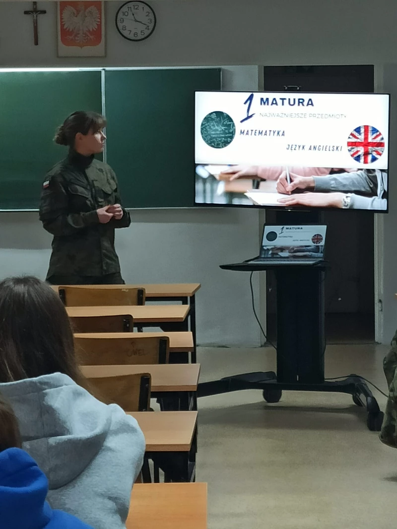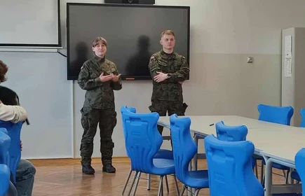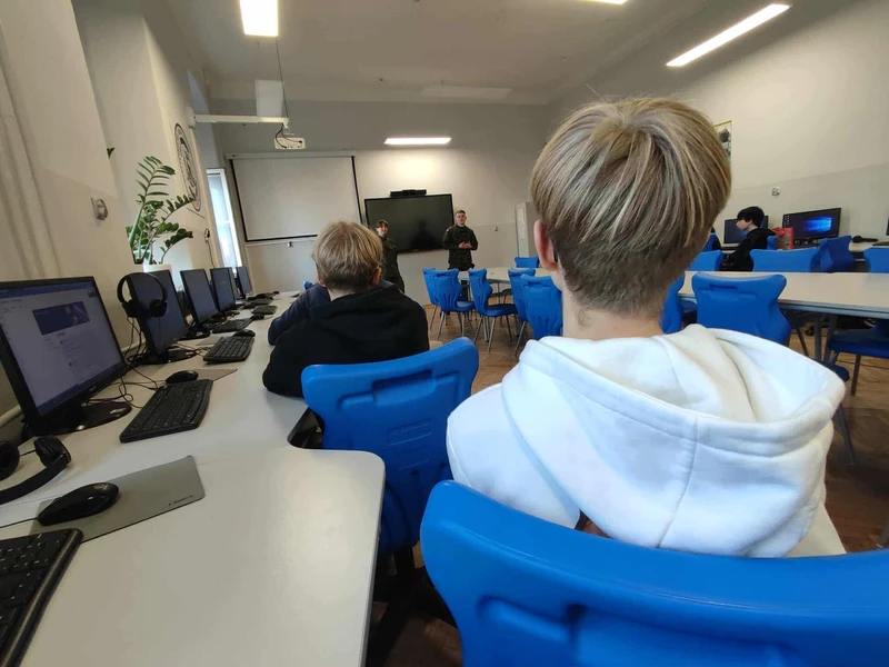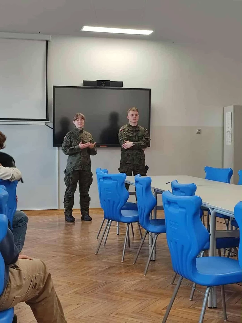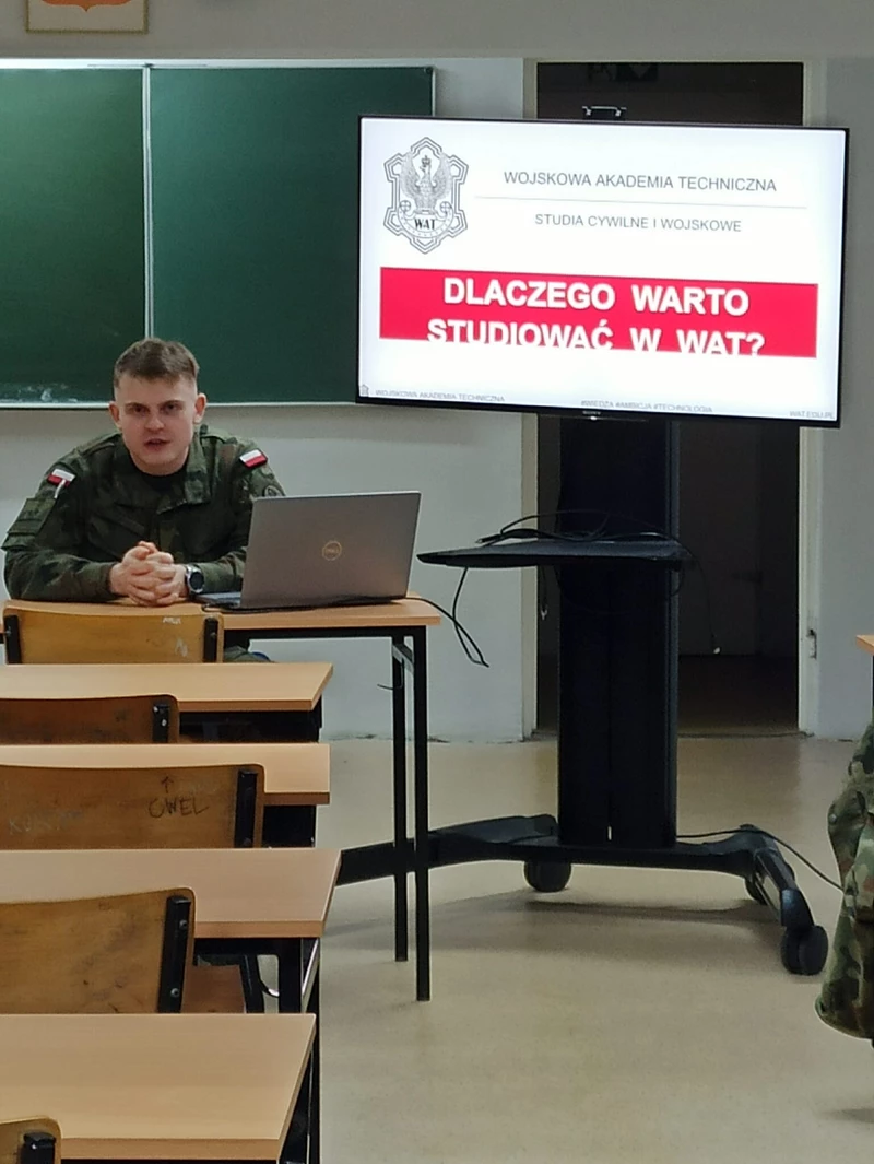 Z uczniami i uczennicami klas Cybermil; 4h i 1h spotkali się studenci Akademii Marynarki Wojennej w Gdyni. Była okazja do zadawania pytań i poznania służby wojskowej z perspektywy żołnierza, a właściwie studenta wyższej uczelni wojskowej. Zwłaszcza przed maturzystami pozostaje pytanie o wybór kierunku studiów. Nasi goście przekonywali, że dobrym wyborem są studia na uczelniach wojskowych.