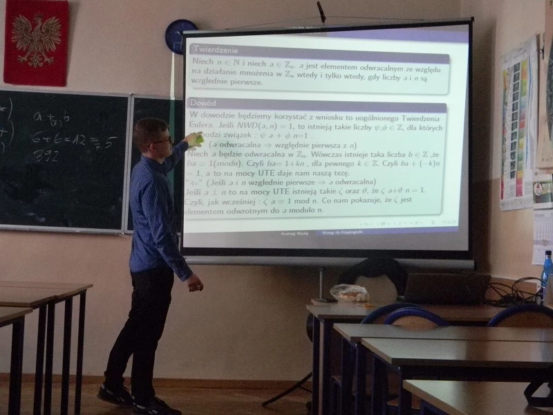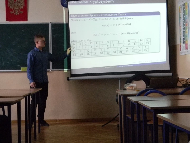 Zaproszony gość przedstawił nam zastosowanie matematyki w kryptografii, czyli szyfrowaniu. Na wstępie usłyszeliśmy historyjkę o Alicji, która chce wysłać wiadomość do Boba, ale musi ją zaszyfrować, żeby nie odczytał jej zazdrosny Stefan. I w ten sposób rozpoczęliśmy wędrówkę po różnych metodach szyfrowania wiadomości.