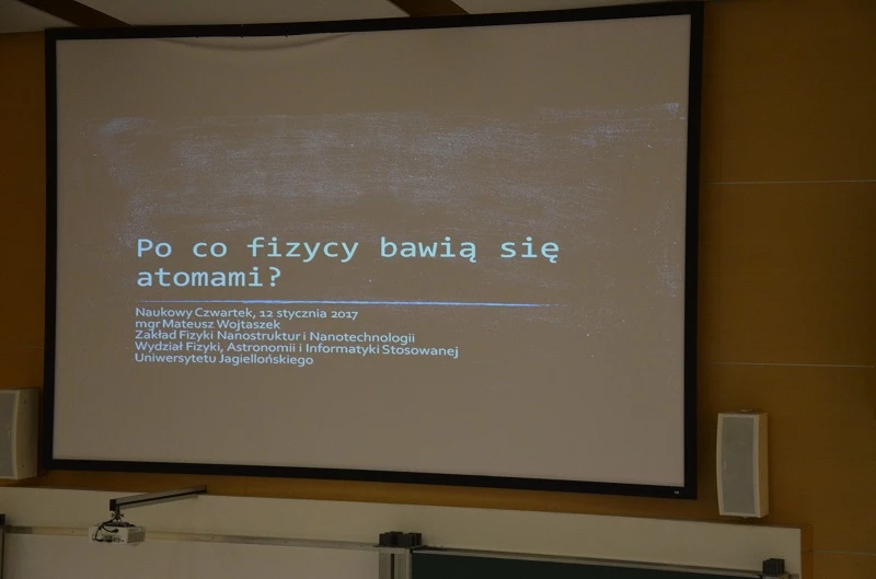 Dnia 13 stycznia 2017r klasy 2b i 2h miały przyjemność uczestniczyć w wykładach organizowanych w ramach Naukowych Czwartków na Uniwersytecie Jagiellońskim w Krakowie. O 8:30 obie klasy zebrały się i wspólnie z panią profesor Elżbietą Jędros, Panią Renatą Guzik i panem profesorem Łukaszem Koniecznym wyruszyły autokarem do Krakowa. Na miejsce, czyli Wydział Fizyki, Astronomii i Informatyki Stosowanej Uniwersytetu Jagiellońskiego wszyscy dotarli o godzinie 10:00, więc każdy miał jeszcze czas aby rozejrzeć się i zobaczyć miejsce, w którym w przyszłości może będzie się uczył. Jako pierwszy miał miejsce wykład z Fizyki pt.: "Po co fizycy bawią się atomami?" przeprowadzony przez mgr Mateusza Wojtaszka. Podczas prezentacji można było zdobyć przydatne informacje o sposobie badania struktury atomów, o których w prosty i ciekawy sposób opowiedział wykładowca.
