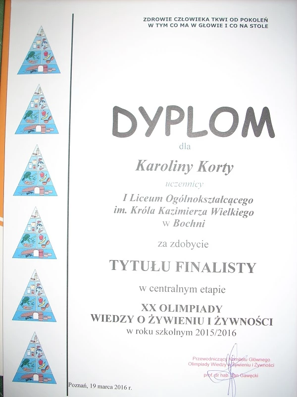W piątek, 18 marca br. w Zespole Szkół Gastronomicznych w Poznaniu odbyły się wzmagania finałowe XX Olimpiady Wiedzy o Żywności i Żywieniu, Bochnię, a zarazem ILO reprezentowała Karolina Korta uczennica klasy II c o profilu biologiczno- chemicznym. Karolina uzyskała tytuł Finalistki Olimpiady. Bezcenną nagrodą dla uczennicy są doświadczenia „ olimpijczyka” i prawdziwa uczta intelektualna w której uczestniczyła.