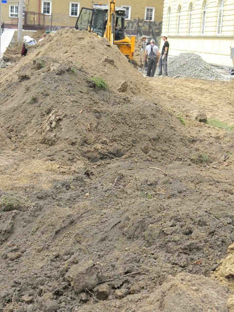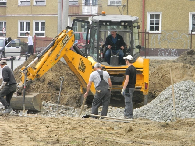 Patrząc na to, co dzieje się przed naszą szkołą aż trudno uwierzyć, że w maju będą tu rosły czerwone berberysy i kasztany a uczniowie zasiądą wśród zieleni na ławeczkach. Na razie jest tak, ale trzymamy kciuki za wykonawców i pogodę.