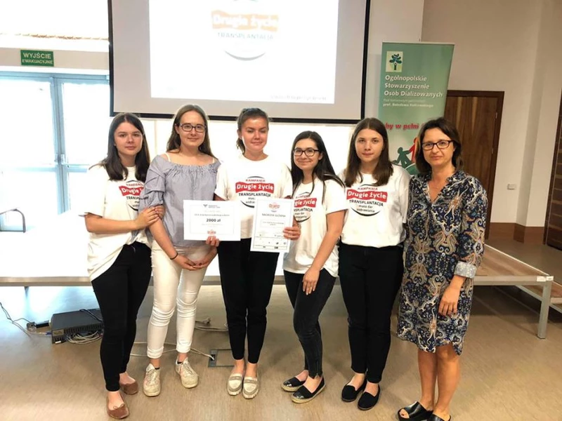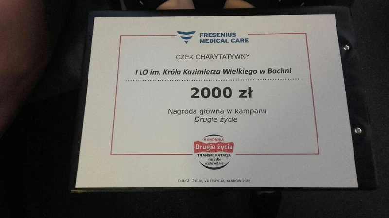 w małopolskiej edycji kampanii „Drugie życie”! Uczniowie klasy 1c o profilu biologiczno-chemicznym pod opieką wychowawcy pani Anny Marciszewskiej- Jaszczyńskiej – szkolnego koordynatora kampanii w ciągu całego roku szkolnego podejmowali z pełnym zaangażowaniem różne działania w ramach ogólnopolskiej kampanii społecznej „Drugie życie. Transplantacja – masz dar uzdrawiania”, promując przeszczepianie narządów. Widoczni nie tylko w murach szkoły , ale również w społeczności lokalnej, propagowali tą szczytną idee. Działania uczniów zostały docenione przez jury Ogólnopolskiego Stowarzyszenia Osób Dializowanych, przyznaniem nagrody głównej. We wtorek 12 czerwca 2018 roku w Szpitalu Specjalistycznym im. Jana Pawła II w Krakowie podczas uroczystości kończącej kampanię, delegacja kl.1c wraz z Panią Anną Marciszewską Jaszczyńską odebrała nagrodę główną, którą jest czek charytatywny o wartości dwóch tysięcy złotych. Uczniowie przekażą go na wybrany przez siebie cel. Uczniowie mają nadzieję, że ich kampania odniesie zamierzone skutki i podniesie świadomość wśród ludzi, jak ważny jest temat przeszczepiania narządów.